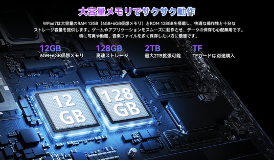 WPad7は、12GB RAM (6GB+6GB仮想メモリ)+ 128GBストレージ を搭載し、スムーズな動作と十分な保存容量を実現。複数のアプリを同時に開いても快適に動作し、動画や写真、ドキュメントの保存にも余裕があります。
