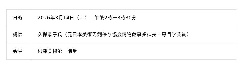 いずれの催事も、当館ホームページ<「イベント情報」>の各申込フォームから参加をお申込みください。受付開始は2026年2月3日(火)午後1時です。1.講演会「光村コレクションの刀剣」
