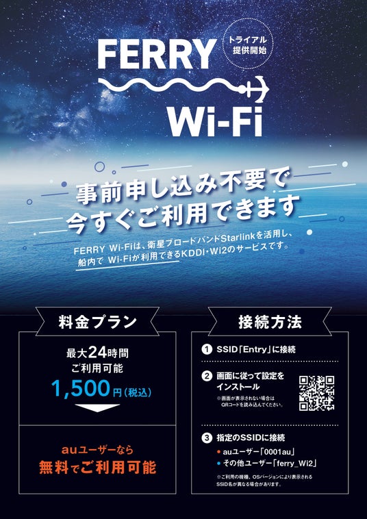 KDDI株式会社と株式会社ワイヤ・アンド・ワイヤレスが提供する高速・低遅延の衛星ブロードバンドStarlinkを活用した船上Wi-Fiサービス「フェリーWi-Fi」を