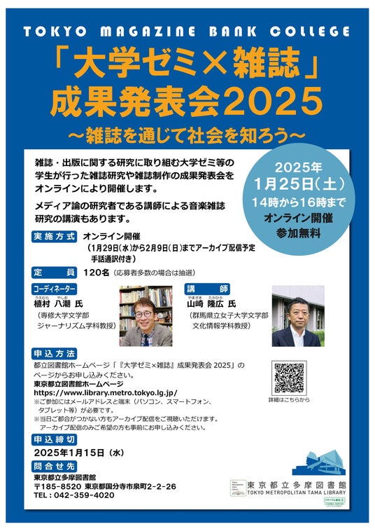 【東京都立多摩図書館 オンライン開催】東京マガジンバンクカレッジ「『大学ゼミ×雑誌』成果発表会2025~雑誌を通じて社会を知ろう~」
