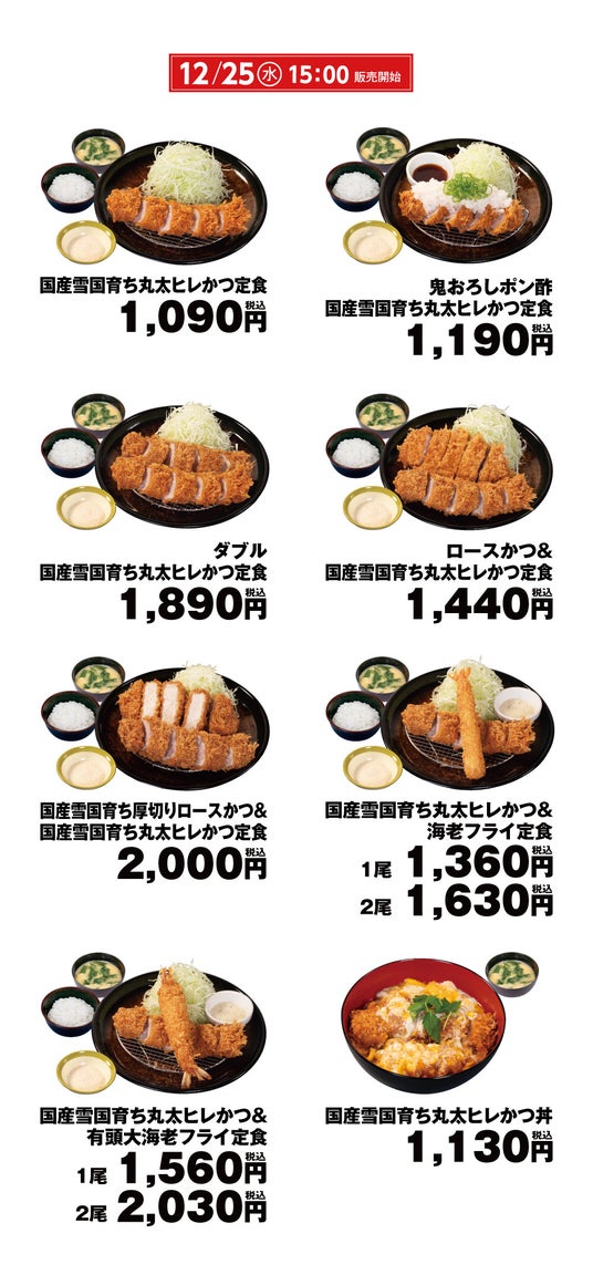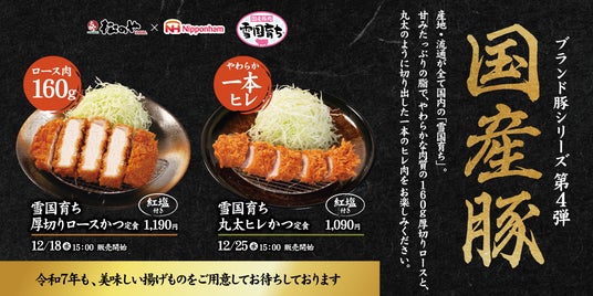株式会社松屋フーズ(本社:東京都武蔵野市、代表取締役社長:瓦葺 一利)では、とんかつ専門店の「松のや」におきまして、2024年12月18日(水)午後3時より「雪国育ち厚切りロースかつ」、2024年12月25日(水)午後3時より「雪国育ち丸太ヒレかつ」を発売いたします。