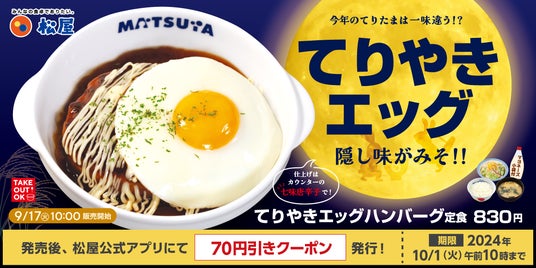 2024年9月17日(火)10時~10月1日(火)10時まで、松弁ネット・松屋モバイルオーダーにてご利用いただける「てりやきエッグハンバーグ定食」の70円引きモバイルクーポンを「松屋フーズ公式アプリ」にて配信いたします。