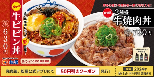 このたび松屋フーズ(本社:東京都武蔵野市、代表取締役社長:瓦葺一利)では、牛めし・カレー・定食・その他丼の「松屋」におきまして、2024年8月6日(火)10時より「牛ビビン丼」「2種盛牛焼肉丼」を販売いたします。