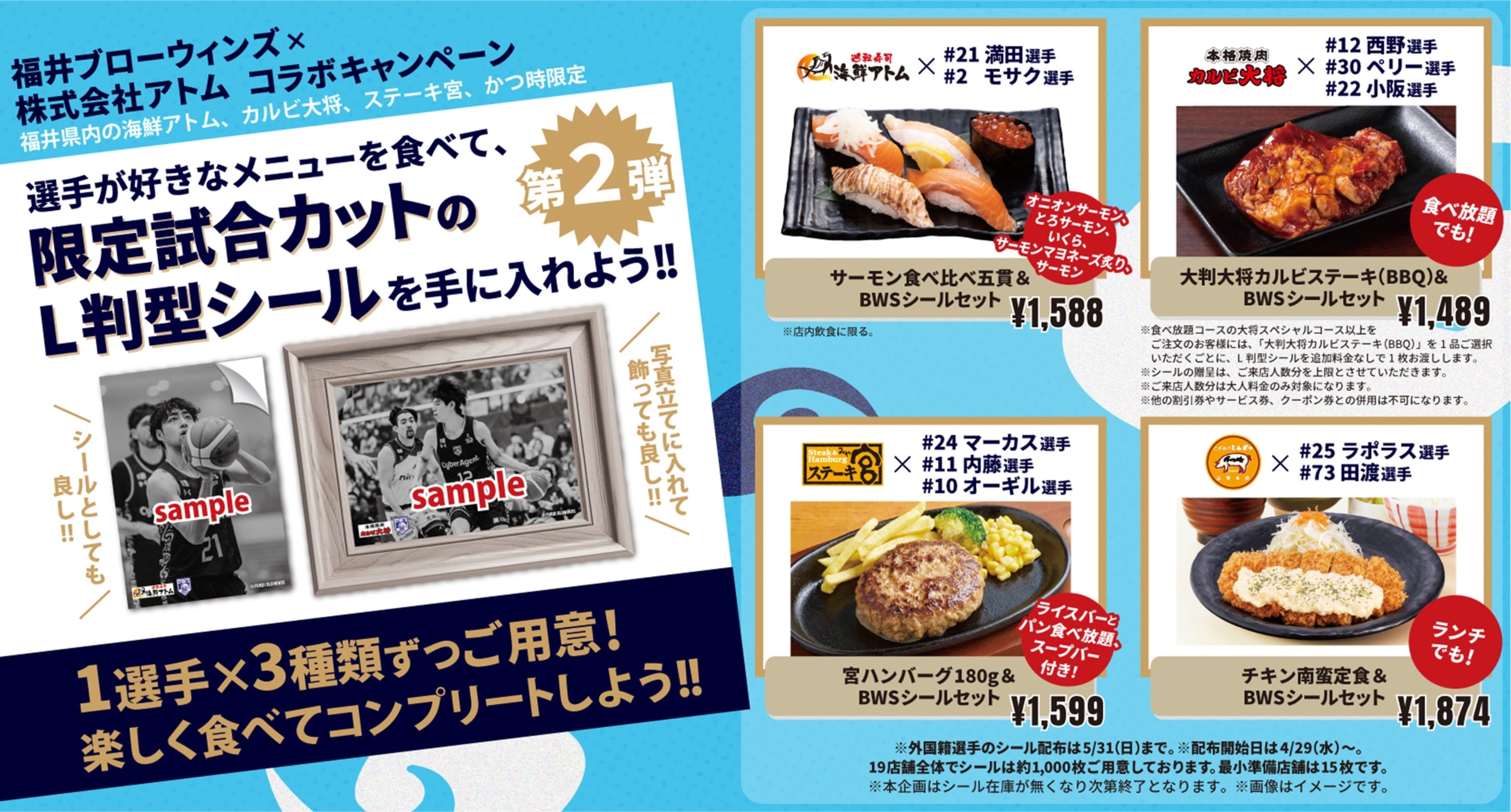 株式会社アトムは株式会社福井ブローウィンズとのコラボ企画として、選手の好きなメニューとオリジナルシールのセットメニューを販売いたします。第1弾とは異なる選手が登場しているので、この機会にぜひ全選手分を集めてみてはいかがでしょうか。
