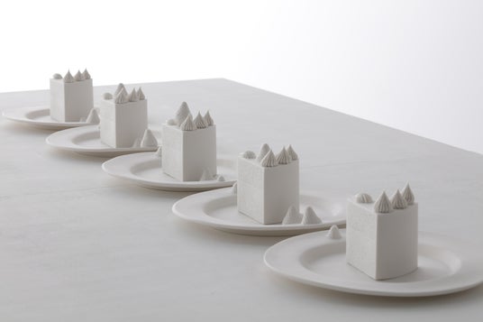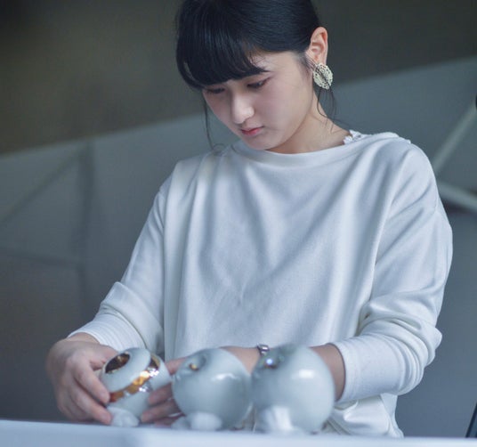 日常や特別な日などに、その作品があるだけで心がときめく様な、人の生活を豊かにする作品をつくることをテーマに制作をしています。近年は「器とそこに盛られるものの関係性」に着目し、制作のコンセプトにしています。陶磁器の器に盛られるものの素材を器と同じ陶磁器にすることによってできる、器とそこに盛られるものの関係性の変化。皆さんの生活に欠かせない身近な素材の陶磁器を使うからこそ生まれる違和感の面白さ。実際にはありえない、陶磁器という素材で作るからこそできる造形の面白さを楽しんでいただければ嬉しいです。