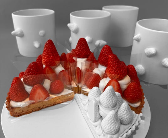 また、その他のアイテムにも前田氏のいちごモチーフのデザインを取り入れ、マドラーや紙ナプキンを収納する器も同じ磁器で製作。カフェのあちらこちらで「器とそこに盛られるものの関係性」を感じていただけます。4月14日(月)~5月31日(土)まで前田氏の独創的なデザインセンスを感じていただける作品をカフェ内に展示していますので、ぜひカフェとアートが融合した空間でのひとときをお楽しみください。
