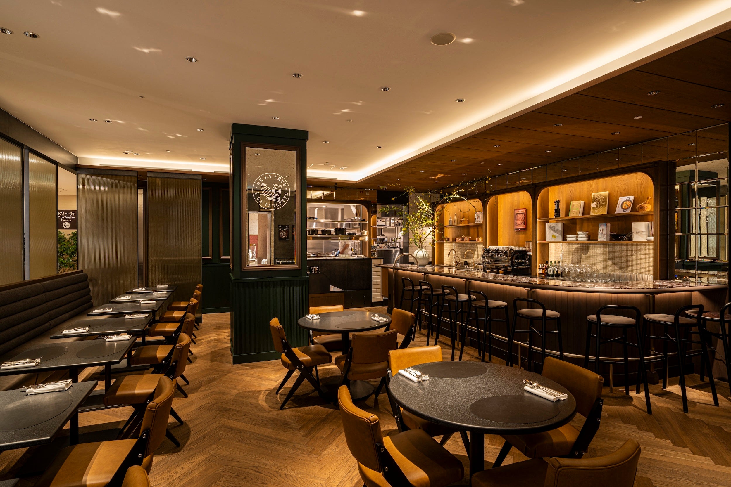 アラン・デュカスの哲学を取り入れ、クラシックとモダンを融合させた空間。天然木と天然石にスチールの質感を合わせ、ダークグリーンとゴールドのアクセントを効かせた空間は洗練されながらも心地よく、どこか親しみやすさを感じさせます。メインダイニングに加え、カウンター席、ボックスシート席、個室をご用意。入り口には「ル・ショコラ・アラン・デュカス」「ル・ビスキュイ・アラン・デュカス」のブティックも併設しました。