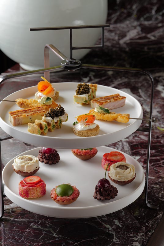 アフタヌーンティーでは、クロックムッシュやキャビアをのせたワッフルなどのセイボリーに加え、春のフルーツを使ったエレガントで洗練された「一口サイズ」のスイーツをご用意。