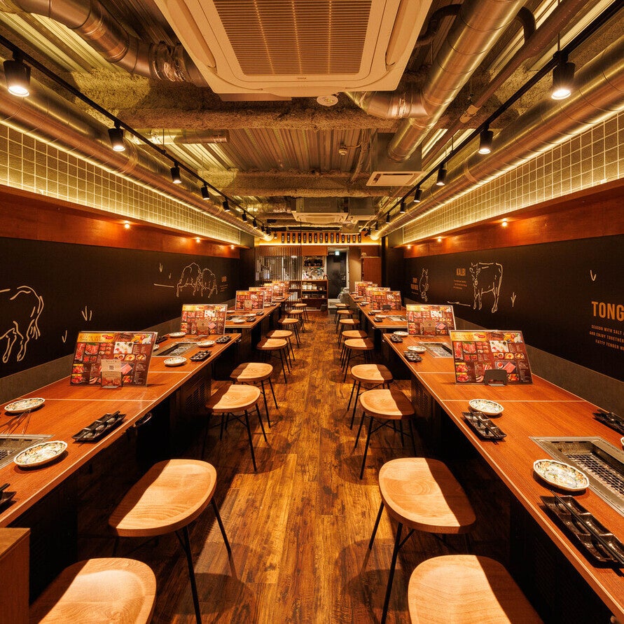 木を基調とした明るくカジュアルな雰囲気の店内 店舗名 : 焼肉食べ放題 カルビとタン 梅田店