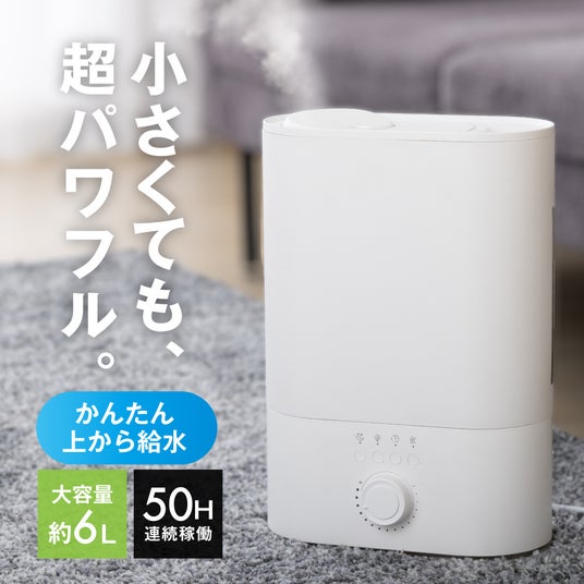 1.上から給水できる「パワフル加湿器」スーパーSALE目玉商品!上から給水できる加湿器。約6Lの大容量、最大加湿量は約500mlと超パワフル。約14畳まで加湿ができ、特に広いリビングやオフィスなど、広範囲をカバーする加湿力が求められる場所でも十分な効果を発揮。静音設計のため、就寝中や作業中も快適な湿度環境を維持できます。