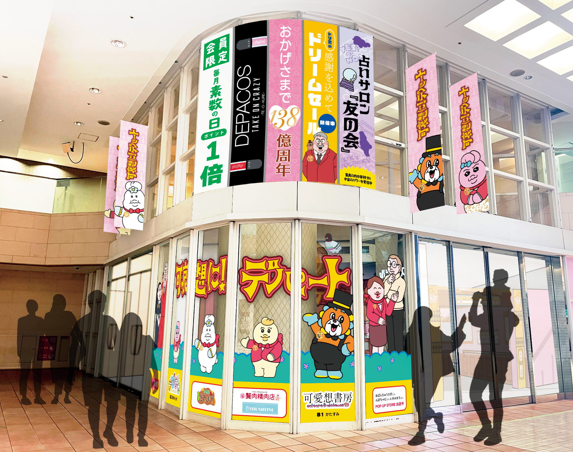 【横浜】100点超の展示とカオスな世界観!「祝 閉店!可哀想に!デパート」展がスカイビルで開催。描き下ろしキャラによる“19タイプ診断”や限定パフェグラスなど見どころ満載!