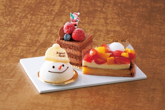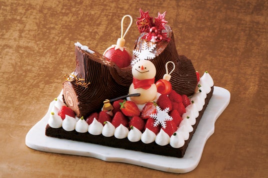 ココア生地でモカキャラメルバタークリームを巻き、濃厚なチョコガナッシュで仕上げたブッシュドノエルを、ガトーショコラの上にのせました。たっぷりとのせたいちごやチョコレートで作られたオーナメントなどが華やかで、木こりの雪だるまも可愛らしく、賑やかなパーティーシーンにぴったりです。