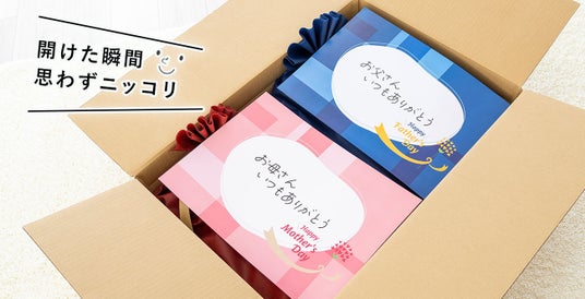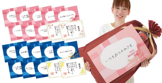 ギフトを見た瞬間、お母さんとお父さんが笑顔になるような「気持ちが伝わる」A3サイズのメッセージカード付き。10種類あるメッセージから、お母さん用、お父さん用にそれぞれ1枚ずつお選びいただけます。
