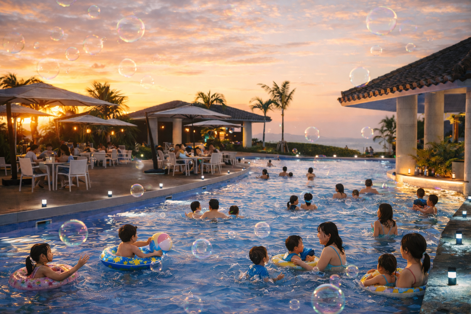 「島とあそぶ 森とつながる」をコンセプトに、亜熱帯の豊かな自然が広がり、世界自然遺産にも登録された沖縄県北部「やんばる」の入り口に位置するオリエンタルホテル 沖縄リゾート&スパ(沖縄県名護市)は、2026年3月20日(金)~4月4日(土)の春休み期間、ならびに4月25日(土)~5月5日(火)のGW期間にガーデンプールをしゃぼん玉で彩る「やんばるdeしゃぼんナイト」を開催します。