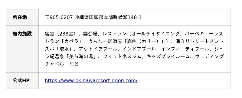 クラブウイング客室イメージ 沖縄本島北部、緑豊かな本部町(もとぶちょう)に位置する、オリオンビールが手がける全室オーシャンフロントのリゾートホテルです。全室50平米以上のゆとりある客室をはじめ、多彩なレストラン、海洋リトリートメントスパ、屋内外プール、天然温泉など、充実した施設を完備。全室スイートのクラブウイングでは、専用駐車場、ラウンジ、プールを備えたワンランク上のラグジュアリーステイを提供します。那覇空港から車で約100分。「エメラルドビーチ」や「沖縄美ら海水族館」といった人気観光スポットも徒歩圏内に位置し、沖縄観光の拠点として最適なロケーションです。「JUNGLIA OKINAWA(ジャングリア沖縄)」のオフィシャル・パートナー・ホテルとしても、沖縄をより深く楽しむための滞在をサポートします。 [NEWS] レストランリニューアル│オープン予定:2026年5月1日(金) The Orion Brasseries & Table(オリオン ブラッスリー&テーブル)