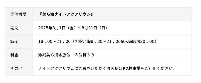 沖縄美ら海水族館(所在地:沖縄県国頭郡本部町 館長:佐藤 圭一)では8月1日(金)~31日(日)の期間、水族館の営業時間を延長する「美ら海ナイトアクアリウム」を開催しますのでお知らせいたします。昼間とは異なる雰囲気の館内で、静かに揺れる光と夜の生き物たちをお楽しみください。