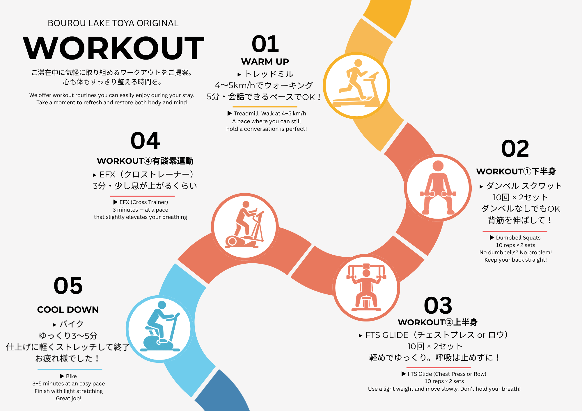 野口観光マネジメント株式会社が運営する「ザ・レイクスイート 湖の栖(BOUROU LAKE TOYA)」では、館内フィットネスジムにて「ワークアウトカード」の提供をスタート。単なる設備利用の枠を超え、非日常の滞在の中で自分と向き合い、身体を整える“ウェルビーイングな体験”を提案します。
