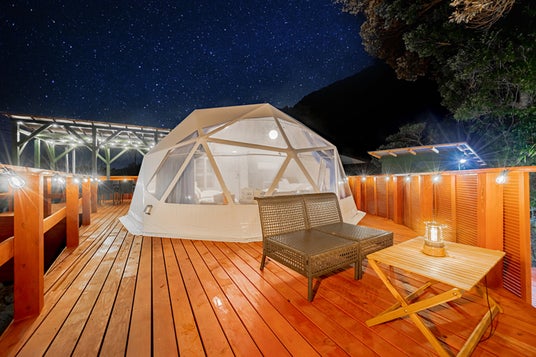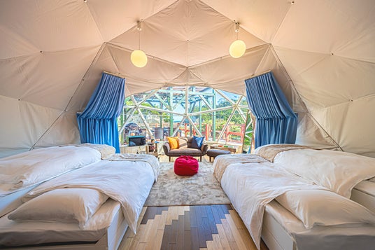 ドームテントにはエアコンも備え、快適なグランピング滞在を叶えます。