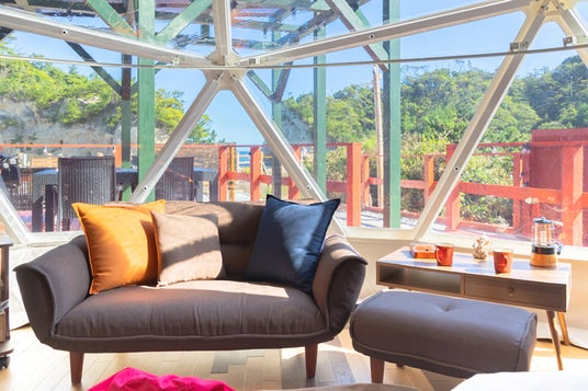 天井の高いユニーク空間のドームテント内にはエアコン完備の快適空間で、高戸小浜海岸の景色を