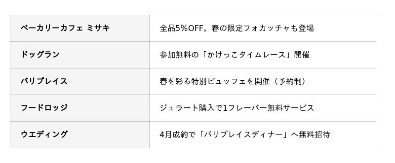 ウエディング 期間中は、各施設で記念企画や春限定サービスも実施します。
