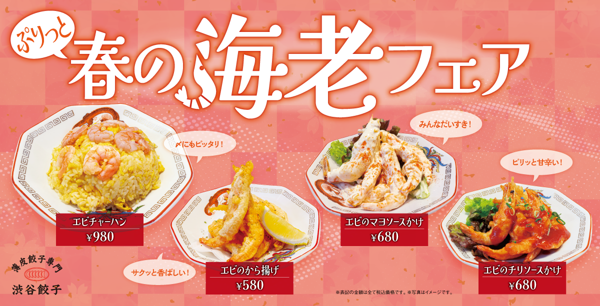 本フェアでは、チャーハン、唐揚げ、マヨソース、チリソースといった中華の定番海老メニューを、渋谷餃子らしいボリューム感とライブ感で提供します。餃子と並んでテーブルを彩る人気食材・海老を主役に据え、春らしい華やかさと満足感のあるラインアップを揃えました。■ 企画の背景:「餃子と楽しむ中華の定番を改めて」