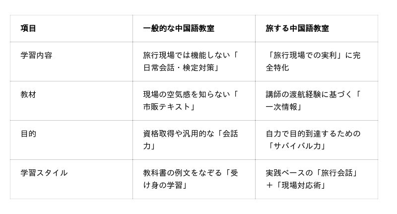 既存の中国語教室・スクールでは「日常会話」や「検定試験対策」が中心であり、旅行で中国語を使いたい人には学習内容のミスマッチが起きていました。