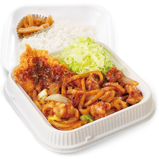 「ホルモン焼きうどんとチキンカツの合い盛り」は、店内飲食だけでなくお弁当としてテイクアウトでもご利用いただけます。