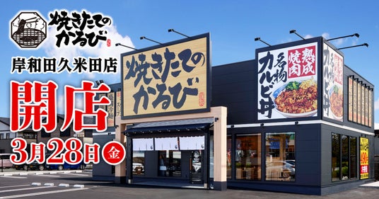 株式会社物語コーポレーション(本社:愛知県豊橋市/代表取締役社長:加藤 央之)は、熟成肉を使用した「焼きたてのカルビ丼」と「ユッケジャンスープ」の専門店『焼きたてのかるび』30店舗目を、2025年3月28日(金)に大阪府岸和田市にオープンいたします。