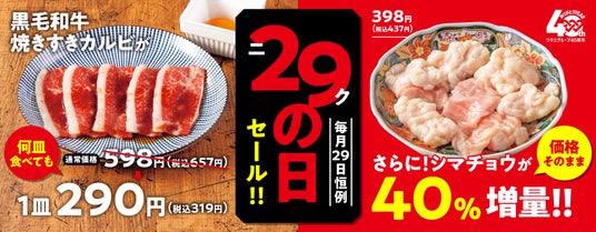 【焼肉の和民】3月29日の「ニクの日」は大人気「黒毛和牛焼きすきカルビ」を通常価格の半額&ワタミ創業40周年記念メニューは「シマチョウ」をおよそ40%増量!