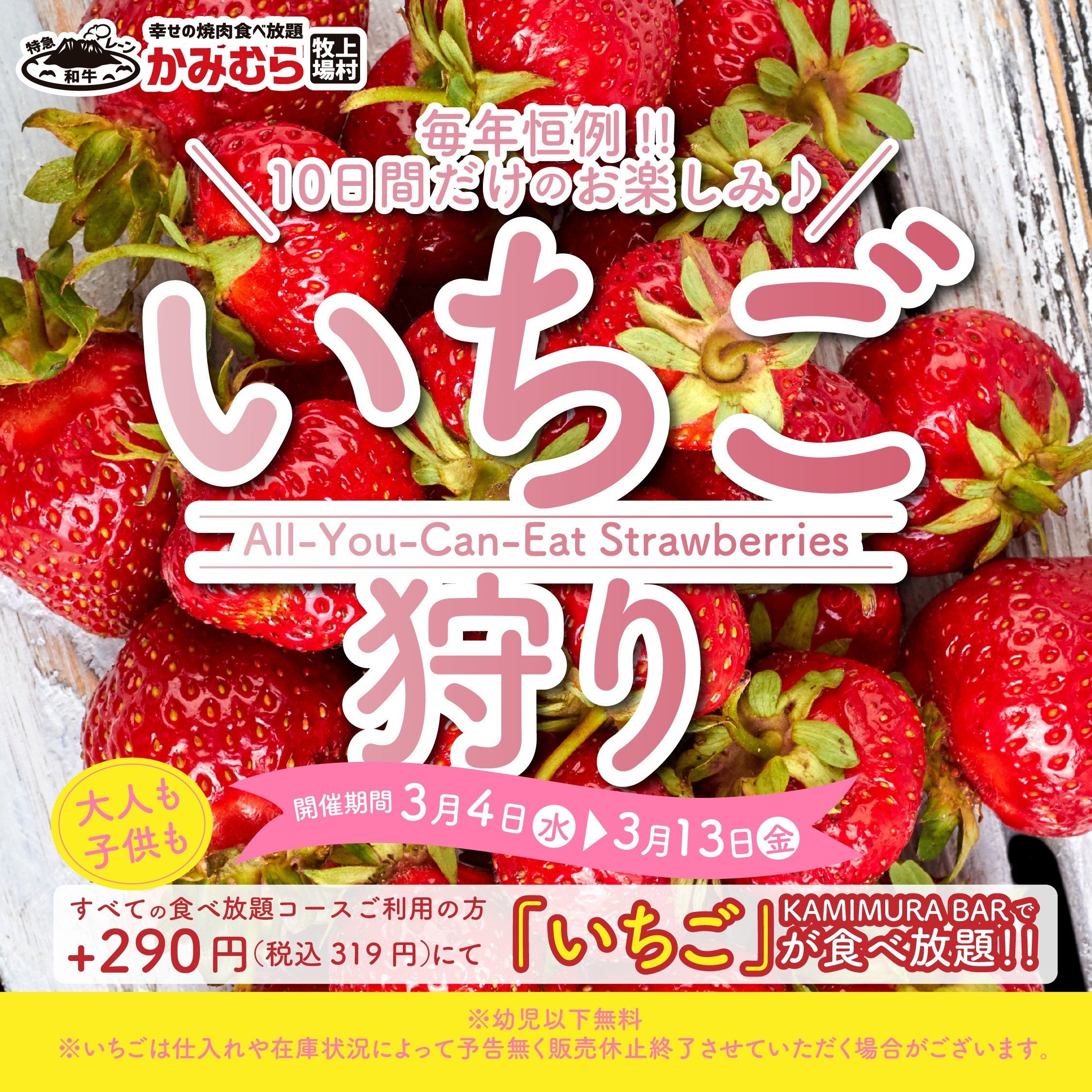 ワタミ株式会社(東京都大田区、以下ワタミ)と国内有数の和牛生産者であるカミチクグループ(鹿児島県鹿児島市)との合弁会社、ワタミカミチク株式会社(東京都大田区、以下ワタミカミチク)が展開する「かみむら牧場」は、2026年3月4日(水)から3月13日(金)までの期間限定で毎年恒例の「いちご狩り」を実施いたします。 2021年の実施からご好評いただいております「いちご狩り」は、すべての食べ放題コースをご注文のお客様を対象に追加料金290円(税込319円)で新鮮な野菜やナムル、デザートやアイスがビュッフェ形式でお楽しみいただけるKAMIMURA BARにて国産のいちごも食べ放題の企画を実施いたします。 春の風物詩のひとつでもある「いちご」を焼肉と一緒に食べ放題でお楽しみいただくことができる絶好の機会です。ご家族やご友人とご一緒に、もちろんおひとり様でも、この機会にぜひお立ち寄りください。