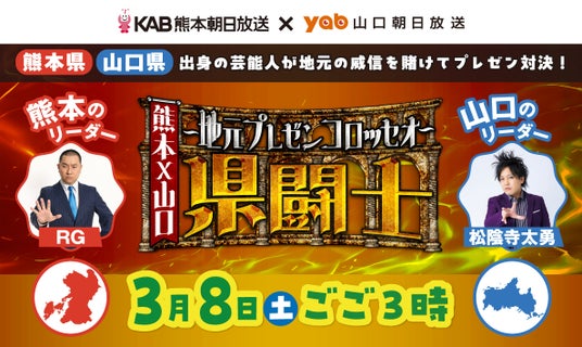 熊本朝日放送株式会社(本社:熊本県熊本市西区、代表取締役社長:⽵内圭介)と山口朝日放送株式会社(本社:山口県山口市、代表取締役社長:天野尚彦)は、2025年3月8日(土)午後3時から『~地元プレゼンコロッセオ~ 熊本×山口 県闘士』を放送します。