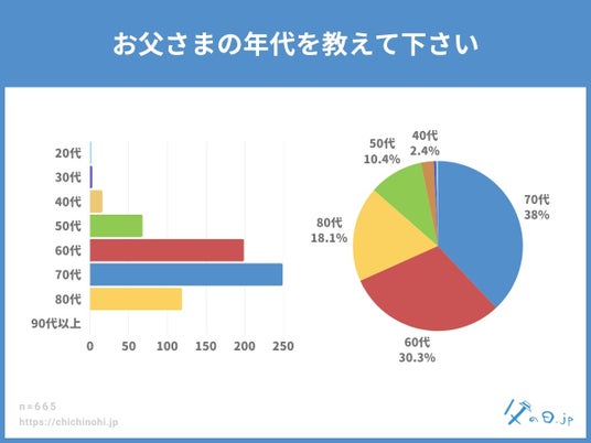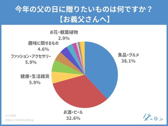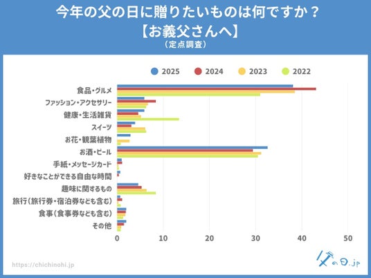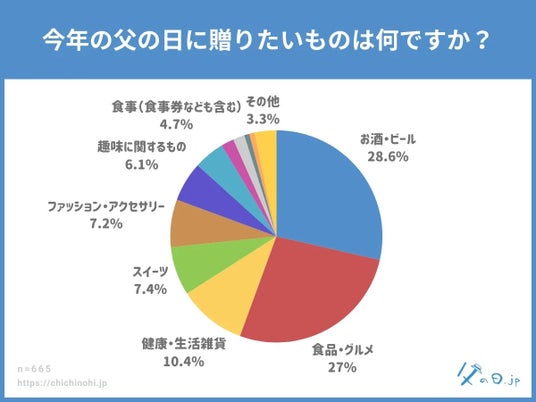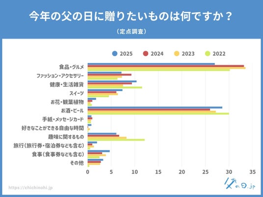 父の日.jp調べ。全国の10代~70代の男女(計665名)を対象にした実態調査アンケート。 父の日についての様々な情報を発信している、父の日に特化した情報メディアサイト「父の日.jp」では、全国の10代~70代の男女(計665名)を対象に「今年の父の日に贈りたいものは何ですか?」というアンケートを実施し、調査データを公開しました。 ■調査トピックス - 「お酒・ビール」が28.6%でトップ、昨年に続き安定した人気 - 「食品・グルメ」が27.0%で僅差の2位、“消えもの”への支持が顕著に - 「旅行」や「食事」など“体験志向”や“個人の趣味”を重視する動きも - 養父は実父よりも“外さない消えもの”志向が顕著に ※父の日の定番「うなぎ」は「食品・グルメ」ジャンルに属します。 調査情報公開URL:https://chichinohi.jp/survey090/ ・アンケート回答者サマリ アンケート回答者の性別・年代 アンケート回答者の父の年代 ・すぐに楽しめる”実用派ギフトが人気を集める2025年の父の日傾向 今回のアンケート結果からは、父の日ギフトにおいて「すぐに楽しめるもの」「日常生活に取り入れやすいもの」への支持が高まっている傾向が読み取れます。 もっとも多かったのは「お酒・ビール」で28.6%。次いで「食品・グルメ」27.0%と、晩酌や食卓で手軽に楽しめる“消えもの系”が今年も高い人気を集めました。 父の日はかしこまった贈り物よりも、「自分では買わないけれど、もらったら嬉しい」ような、ちょっとしたご褒美感のあるギフトが好まれる傾向が続いています。また、「健康・生活雑貨」(10.4%)や「ファッション・アクセサリー」(7.2%)など、実用性を重視したギフトや、身につけるアイテムにも一定のニーズがあることがわかりました。 一方で、「手紙・メッセージカード」(0.8%)や「自由な時間」(0.8%)といった“形のないギフト”は少数派ではあるものの、毎年一定の支持を得ています。 モノを贈ることが主流である一方、感謝の気持ちや心遣いを重視する層も存在しており、今後は“モノ+気持ち”のギフト提案にも注目が集まりそうです。 ・“体験志向”や“個人の趣味”を重視する動きも 定点調査を通して分かったのは、「お酒・ビール」と「食品・グルメ」が長年にわたり父の日ギフトの“二大定番”であること。今年2025年もその傾向は続いており、すぐに使える・楽しめるギフトへの安心感と満足度の高さがうかがえます。 一方で、「健康・生活雑貨」(10.4%)や「食事(食事券なども含む)」(4.7%)、「旅行(旅行券・宿泊券なども含む)(2.0%)」など、“贈る相手に合わせたパーソナルな選択”や、体験志向のプレゼント需要もじわじわと広がっており、今後のギフト選びにおいて“カスタマイズ”がキーワードとなるかもしれません。 ・養父は実父よりも“外さない消えもの”志向が顕著に 義父へのギフトでは「食品・グルメ」(38.1%)が最多、次いで「お酒・ビール」(32.6%)と続き、両者で70%超という圧倒的な結果に。一方、実父の場合は「お酒・ビール」(28.6%)が1位、「食品・グルメ」(27.0%)が2位と、傾向は似ているものの、義父の方が“外さない定番”をより重視する傾向が見受けられました。 これは、義父という距離感のある存在に対して、「失礼なく、それでいて喜ばれるものを贈りたい」という気遣いが強く表れていると考えられます。消費できる“消えものギフト”は、好みに左右されにくく、形式も保てるため、贈り手にとって安心できる選択肢となっているようです。 また、「健康・生活雑貨」(5.9%)や「ファッション・アクセサリー」(5.9%)も一定の支持を得ており、「少し気の利いた実用品」を選ぶ傾向も見られました。実父よりも“おしゃれすぎない”落ち着いた選択肢が多く、実用品の中でも相手に負担を与えない、使いやすさ重視のアイテムが好まれる傾向があります。 ・定点調査による年度別の推移~義父への父の日ギフト、「お酒・ビール」が過去最多に 義父へのギフトとして定番化している「お酒・ビール」は、2022年以降毎年安定した人気を保ちつつ、2025年はついに過去最高の32.6%に達しました。手軽に贈れて、好みさえ外さなければ高確率で喜ばれる“無難だけれど嬉しい”ギフトとしての地位を確立しており、気を遣いがちな義父への贈り物として「ちょうどいい」選択肢となっていることがうかがえます。 背景には、近年のギフト選びにおいて「外さない」「使ってもらえる」「手軽に手配できる」といった実用性や手軽さを重視する傾向が強まっていることが挙げられます。 日常的に消費される“消えものギフト”への信頼感が、義父へのギフトにおいても強く表れている結果といえるでしょう。 一方で、「趣味に関するもの」は2022年以降、年を追うごとに減少傾向が続き、2025年にはわずか4.6%と過去最低値を記録しました。義父の趣味や好みに合わせたギフトは、気持ちはこもっているものの「好みに合わなかったらどうしよう」という不安があり、選ぶ側にとってはハードルが高いカテゴリで