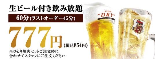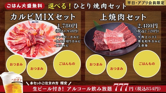 牛角では、ライフスタイルの変化に伴う多様な外食の楽しみ方へのご提案の一環として、お一人様でも気軽に焼肉を楽しんで頂けるよう「選べる!ひとり焼肉セット」を平日限定・アプリ会員様限定で販売いたします。また、「ひとり焼肉セット」ご注文の方限定で「生ビール付きアルコール飲み放題」を777円(税込854円)でご注文いただけます。お得なセットで気軽に焼肉をお楽しみください。