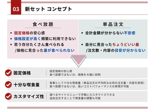 コロワイドグループの株式会社レインズインターナショナル(本社:横浜市西区 代表取締役社長:澄川浩太)が展開する焼肉チェーン「牛角」では、2025年5月29日(木)より、お得な“新セットメニュー”の提供を全国の牛角店舗にて開始いたします。 近年の物価高騰により、焼肉の主要食材である肉・米などの価格も上昇、仕入価格の高騰に伴い各社の販売価格も上昇傾向にあります。また、名目賃金は上昇しているものの、価格上昇を吸収しきれておらず、お客様の「財布の紐はかたい」状況が継続しています。 そのような状況下で、焼肉の主流である「食べ放題」の価値は、お得感から「価格固定の安心感」に変化しているのではないかと考えます。また、お客様の嗜好が多様化し外食に求めるものも変化するなかで、 「量より質」を求めるニーズも高まっています。 こうした背景をふまえ、牛角では「日常の気軽な焼肉」をテーマに「新セット」を開発いたしました。1セットに「お肉5種+選べるおつまみ+選べる〆もの+デザート」を盛り込んだ、“これだけで満足” いただける内容です。“無理なく・おいしく・ちょうどよく”楽しめる新しい焼肉の定番として、日常の外食や友人・家族との気軽な食事シーンに最適な選択肢を提案してまいります。
