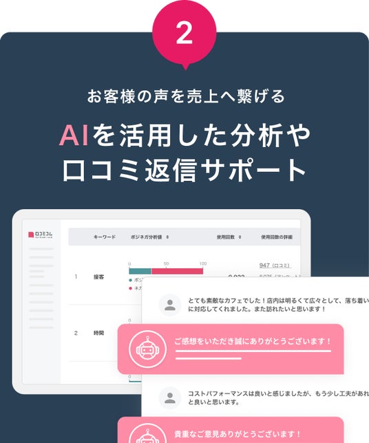 集約した口コミやアンケートをAIが解析・スコア化することで、分析の難しい口コミを定量的に様々な軸で分析し、経営判断や店舗改善に活かすことができます。また、口コミの返信もAIがサポートするので、お客様との円滑なコミュニケーションを実現します。