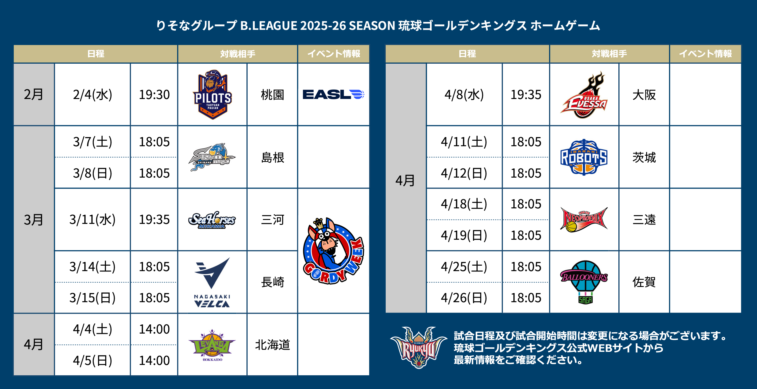 【琉球ゴールデンキングス】りそなグループ B.LEAGUE 2025-26 SEASON 後半戦(32節-36節) 試合開始時間決定のお知らせ