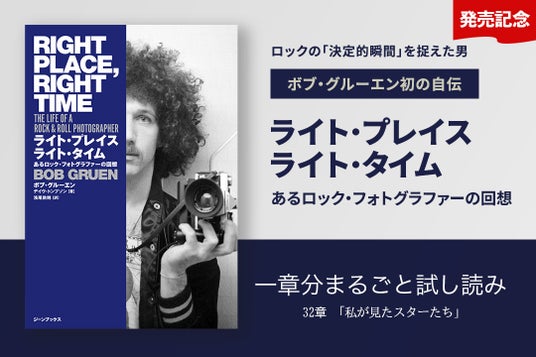 ジョン・レノン、ボブ・ディラン、ミック・ジャガー、エルトン・ジョン、セックス・ピストルズ、キッス、クラッシュ…伝説的ミュージシャンたちとともに1960年代から半世紀以上を歩んできたロックフォトグラファー、ボブ・グルーエン初の回想録『ライト・プレイス ライト・タイム あるロック・フォトグラファーの回想』が遂に日本上陸。