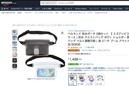 Fun Standard株式会社(株式会社RKB毎日ホールディングス グループ、本社:福岡県大野城市、代表取締役:大屋良介、笹森 広貴)が展開するライフスタイルブランド「BELLEMOND(ベルモンド)」は、IP68等級の完全防水・防塵性能と高い収納力を両立した防水ポーチの新商品『ミズアソビPlus』を2025年春に発売いたしました。 そしてこのたび、発売後初となるセールキャンペーンをAmazon・楽天市場にて同時開催いたします。 AmazonではSサイズ限定で300円OFFクーポンを、楽天市場ではS・Lサイズ両方で使えるクーポンを配布中です。 これからのレジャーシーズンに向けたお得な機会を、ぜひご利用ください。 ライトブルー着用イメージ ■ 発売後、初のセールを開催!|期間限定・数量限定 本製品の発売後初となるセールを2025年4月16日より開催しています。 Amazon・楽天ともにクーポン形式での割引となり、各モールごとに対象サイズが異なりますのでご注意ください。 期間:2025年4月16日(水)~4月30日(水) ▼Amazon 対象:ミズアソビPlus Sサイズ 内容:300円OFFクーポン配布 Amazon公式ストア ▼楽天市場 対象:ミズアソビPlus S・Lサイズ 内容:300円OFFクーポン配布(商品ページ単位) 楽天市場クーポンURL: https://coupon.rakuten.co.jp/getCoupon?getkey=OFhBTy03T0ZMLVRCVU4tUTJLRg--&rt= 楽天市場公式ショップ ■ 累計ヒット「ミズアソビ」シリーズの進化版「ミズアソビPlus」 「ミズアソビPlus」は、Amazon防水ポーチカテゴリでベストセラー1位を獲得した「ミズアソビ」の上位モデルです。(2025年3月現在) Amazonベストセラーを獲得した「ミズアソビ」 スマホや財布を水・砂・泥から守る「IP68等級」の防水・防塵性能と使いやすいサイズ感で高評価を得た従来モデルに、お客様から寄せられた「もっとたっぷり入れたい」という声をもとに開発されました。 マチ付きの立体構造により収納力を大幅にアップしつつ、防水性能やスタイリッシュな外観はそのままに。アウトドアやフェス、旅行、防災など、より多様なシーンで活躍する万能ポーチです。 パッケージデザインと収納量「クリアブラック」 ■ 商品の特長|“安心して水と遊べる”設計 完全防水・防塵設計(IP68) 水深1.5mで30分の防水性能と、砂・埃も通さない完全防塵。第三者機関「SGS」にて品質検証済。 3重チャック+面ファスナーフラップで強力密閉 水の侵入を徹底的にガードする多層構造で、海や川、雨天でも安心。 マチ付き大容量設計(Plusモデル限定) 最大8.5cmのマチで、ペットボトル・長財布・メガネケース・キーケースなども余裕で収納可能。 体にフィットする“ズレにくい”伸縮ストラップ ウエストにもショルダーにも対応し、動きやすくズレにくい設計。長さ調整も自在。 選べる2タイプ×全6色展開 中身が見える「クリアタイプ」と、透けない「不透過タイプ」の2タイプ。全6色のカラバリで家族使いやギフトにも◎ ■ 使用シーン ミズアソビPlusは以下のような幅広いシーンで活躍します。 ・海・川・湖でのアウトドアやSUP・釣り ・夏フェス・BBQ・プール・キャンプ ・リゾート地や温泉旅行での貴重品携帯 ・自転車・バイク走行時の雨対策 ・非常時や防災バッグの貴重品ケースとして ■ 商品概要 サイズ展開 Sサイズ:W20×H16×D8.5cm / Lサイズ:W24×H16×D8.5cm カラー ブラック / ホワイト / ブルー / オレンジ / イエロー / グリーン タイプ クリアタイプ / 不透過タイプ 防水等級 IP68(完全防水・完全防塵) 付属品 伸縮ストラップ(長さ調整可能) ■ご購入はこちら Amazon・楽天ともにクーポン形式での割引となり、各モールごとに対象サイズが異なりますのでご注意ください。 期間:2025年4月16日(水)~4月30日(水) 【Amazon】 対象:ミズアソビPlus Sサイズ 内容:300円OFFクーポン配布 Amazon公式ストア: Amazon公式ストア 【楽天市場】 対象:ミズアソビPlus S・Lサイズ 内容:300円OFFクーポン配布(商品ページ単位) 楽天市場クーポンURL: https://coupon.rakuten.co.jp/getCoupon?getkey=OFhBTy03T0ZMLVRCVU4tUTJLRg--&rt= 楽天市場公式ショップ ■ BELLEMONDについて BELLEMOND(ベルモンド)は、iPadフィルムやスマホアクセサリーを中心に、多くのお客様に「使ってよかった」と思っていただける製品を展開するライフスタイルブランドです。 2025年以降は、扇風機・日傘・アロマディフューザーなど、より多くのシーンに寄り添う製品を通じて、10万人のユーザーとつながるブランドを目指しています。 ベルモンドのロゴ 【BELLEMOND公式ショップ】 Amazon:https://www.amazon.co.jp/stores/page/378CB368-6A7C-4B49-A2F6-92511350DFE6?channel=PRT-brand 楽天市場:https://www.rakuten.ne.jp/gold/mobile123/