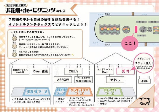 今回の企画では、7店舗の内お客さんが自分好みの商品を選び、自分だけのランチBOXを作る「お花畑・de・ピクニックvol.2」を3月29日の1日限定で開催!のおがたチューリップフェア会場内での出店を通じ、市内飲食店の魅力を知ってもらう取り組みです。