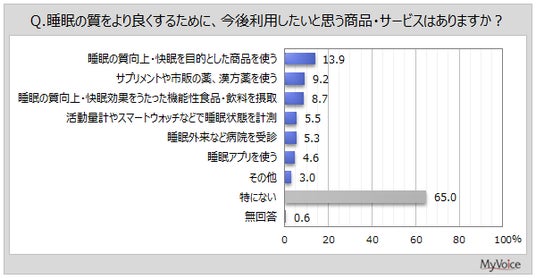 睡眠の質を良くするために、今後利用したい商品・サービスは(複数回答)、「睡眠の質向上・快眠を目的とした商品」が13.9%、「サプリメントや市販の薬、漢方薬」「睡眠の質向上・快眠効果をうたった機能性食品・飲料」がそれぞれ約9%となっています。