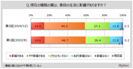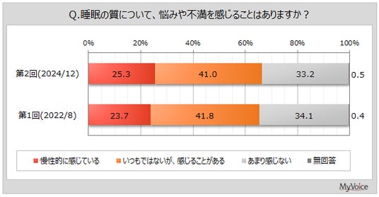 マイボイスコム株式会社(東京都千代田区、代表取締役社長:高井和久)は、2回目となる『睡眠の質』に関するインターネット調査を2024年12月1日~7日に実施しました。
