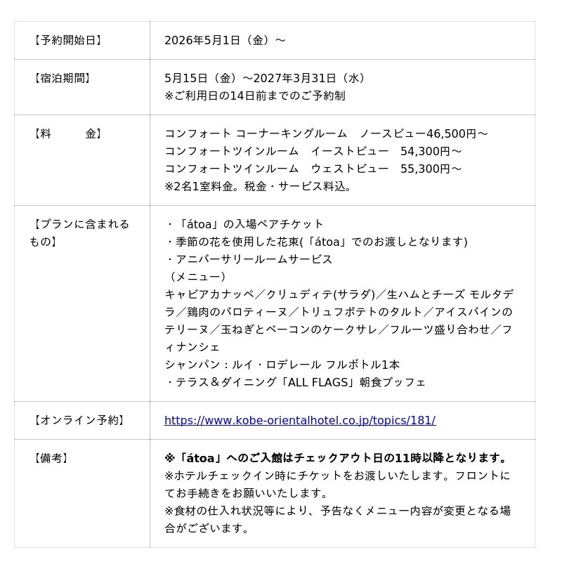港町・神戸を象徴する神戸メリケンパークオリエンタルホテルから、大切な人との記念日を彩る究極のプランが発表されました。