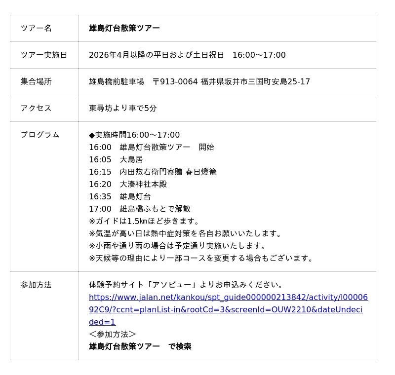 福井を代表する景勝地であり、古くから厚い信仰を集める「雄島(おしま)」。この地で、2026年4月から始まる新しい観光体験**「雄島灯台散策ツアー」**の予約受付が、体験予約サイト「アソビュー」にてスタートしました。