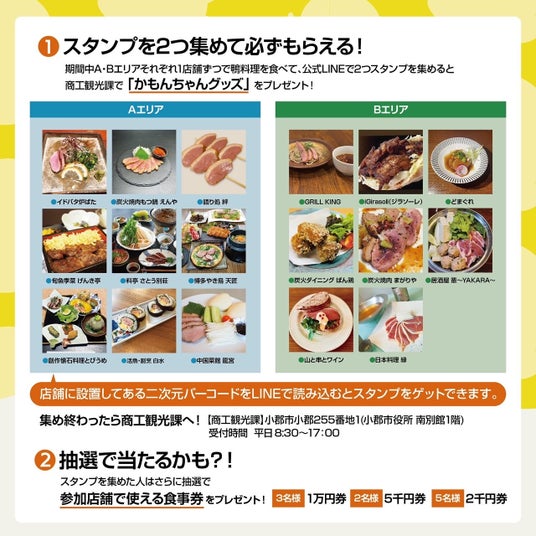 参加方法:(1)小郡市商工会公式LINEに友だち登録。(2)鴨グルメを食べて、飲食店に設置している二次元コードを読み取りスタンプをゲット。(3)スタンプを2つ集めて小郡市役所商工観光課でかもんちゃんグッズと引き換え。※食事券の抽選は、当選者のみに通知します。