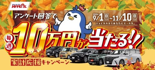 新しい車の乗り方を提案する株式会社ジョイカルジャパン(本社:東京都千代田区/代表取締役社長 CEO 早川 由紀夫、以下、ジョイカル)は、昨今の物価高騰に伴う自動車購入者を支援するため、毎週最高10万円、期間中合計で600万円が当たる「アンケート回答で毎週10万円が当たる!!家計応援キャンペーン」を、2024年9月1日(日)~2024年11月10日(日)までの期間限定で開始いたします。