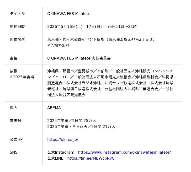 ミラフェート株式会社(所在地:沖縄県那覇市、代表取締役:笠井誉文)は、通算11回目、10周年を迎える「OKINAWA FES Milafete(オキナワフェス ミラフェート)」において、2026年5月16日(土)・17日(日)の2日間、東京都・代々木公園イベント広場にて開催される本イベントの出演アーティスト第一弾が決定したことをお知らせいたします。