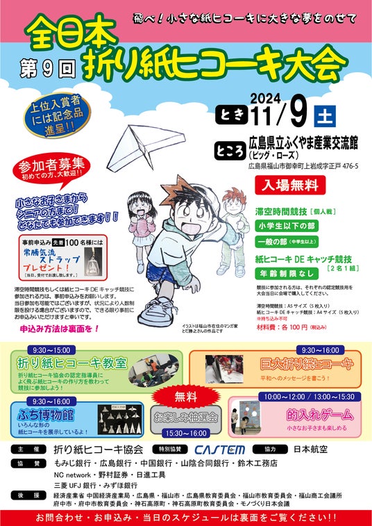 精密鋳造メーカーである株式会社キャステム(本社:広島県福山市、代表取締役:戸田拓夫)が運営事務局を務める『折り紙ヒコーキ協会』は2024年11月9日(土) 折り紙ヒコーキの滞空時間を競う『第9回全日本折り紙ヒコーキ大会』を開催致します!