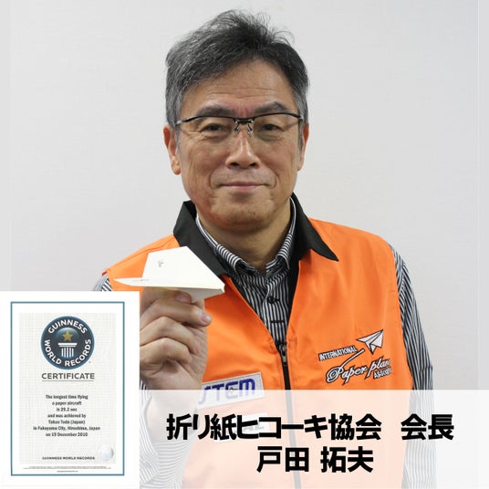 1995年に設立された折り紙ヒコーキ協会は、室内滞空時間ギネス世界記録保持者でもある戸田拓夫が会長を務めています。(2009年に紙ヒコーキ室内滞空時間で27.9秒のギネス世界記録を達成。その後2 9.2秒で更新)