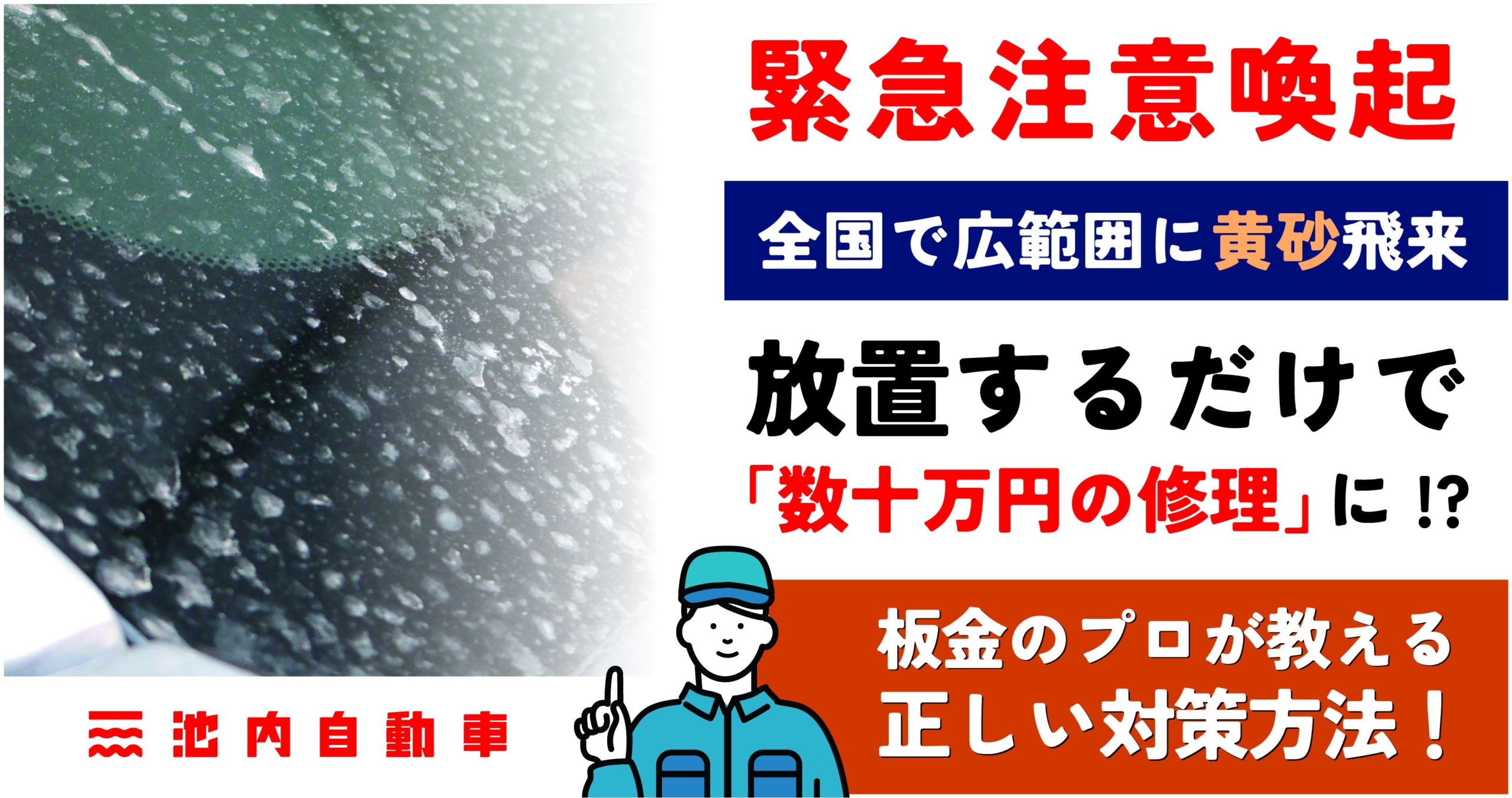 放置は「サビ」や「塗装の陥没」の原因に。黄砂の脅威から愛車を守るため、池内自動車がLINE登録で2,000円割引の緊急キャンペーンを開始。