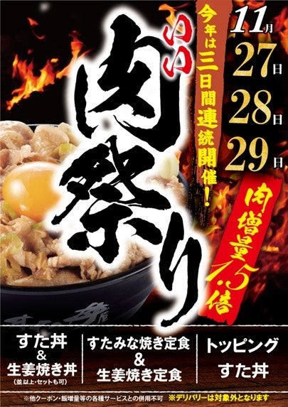 丼チェーン「伝説のすた丼屋」「名物すた丼の店」を運営する株式会社アントワークス(所在地:東京都杉並区、代表取締役:早川 淳)は、通常毎月29日、“29(肉)” にちなみ、全国の「伝説のすた丼屋」および「名物すた丼の店」の店舗(一部店舗を除く)にて、全9品の対象商品の肉がもれなく50%増量となる『肉の日キャンペーン』を開催しております。今年は11月27日・28日・29日を“いい肉祭り”と称して、『肉の日キャンペーン』を3日間連続で開催いたします。